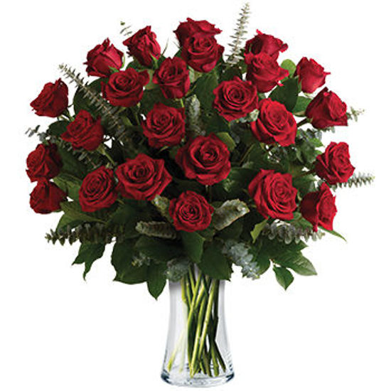 When it comes to delivering romance in a big way, two dozen gorgeous red roses hand arranged in a glass vase, are a brilliant choice.