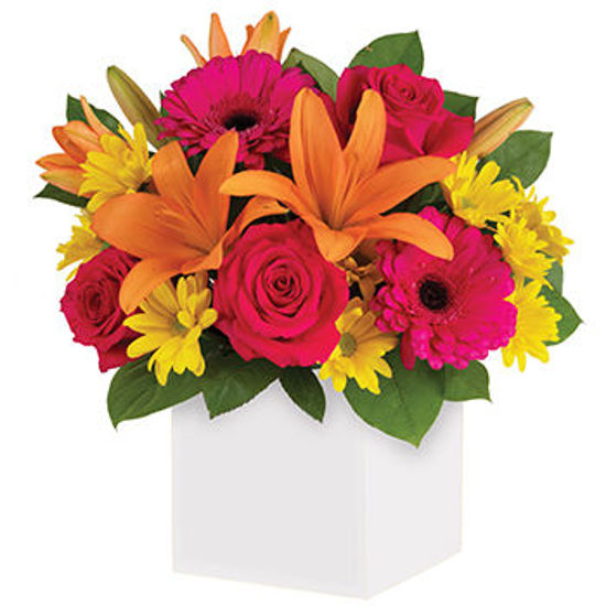 Featuring orange lilies, pink roses, yellow daisies, and hot pink gerberas, this perfect combination of colours will brighten up any room and add a touch of cheer to the occasion. Our florists know how to create magic with flowers, and this box is no exception.